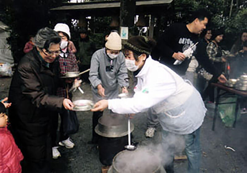 以前は子供会主催で始まった行事ですが現在は地域の社会福祉協議会と神社との共同開催。といっても餅つき、しめ縄などの分類、ぜんざいの振る舞いとすべて地域の方々のボランティアで成り立っています。